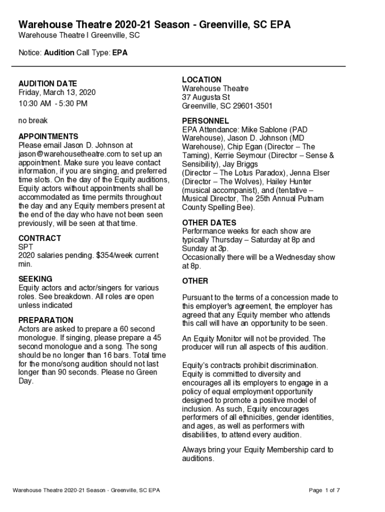 Warehouse Theatre 202021 Season Greenville, SC EPA Warehouse Theatre | Greenville, SC Notice: Audition Call Type: EPAAUDITION DATE Friday, March 13, 2020 10:30 AM 5:30 PMLOCATION Warehouse Theatre