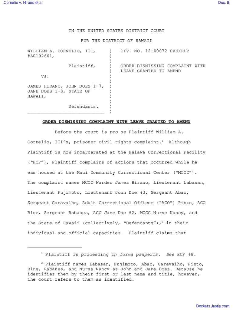 Cornelia v. Piano et Aldo. 9IN THE UNITED STATES DISTRICT COURT FOR THE DISTRICT OF HAWAII WILLIAM A. CORNELIA, III, #A0192661, Plaintiff, vs. JAMES PIANO, JOHN DOES 17, JANE DOES 13, STATE OF HAWAII,