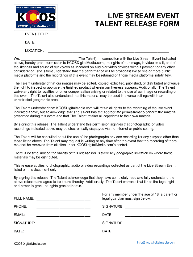 LIVE STREAM EVENT TALENT RELEASE FORM EVENT TITLE: ___ DATE:___LOCATION:___We, ___ (The Talent), in connection with the Live Stream Event indicated above, hereby grant permission to KCOSDigitalMedia.com,