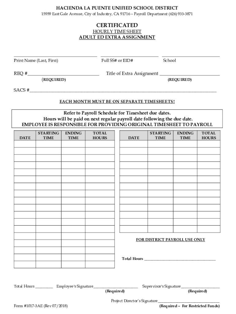 HACIENDA LA PUERTO UNIFIED SCHOOL DISTRICT15959 East Gale Avenue, City of Industry, CA 91716 Payroll Department (626) 9333871CERTIFICATEDHOURLY TIME SHEET ADULT ED EXTRA ASSIGNMENT ___ ___ ___ Print