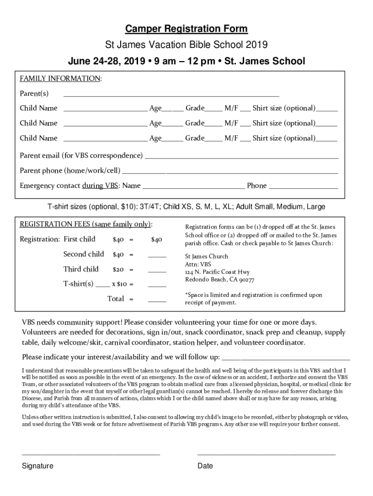 Get the free Camper Registration Form St James Vacation Bible School ...