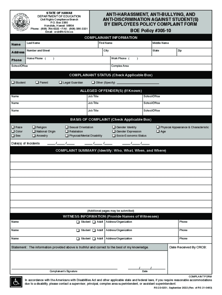 STATE OF HAWAII DEPARTMENT OF EDUCATIONANTIHARASSMENT, ANTIBULLYING, AND NONDISCRIMINATION AGAINST STUDENT(S) BY EMPLOYEES POLICY COMPLAINT FORM BOE Policy #30510Civil Rights Compliance Branch P.O.