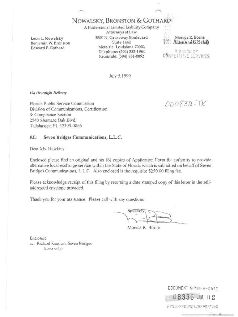 KOWALSKI, BRONSON & GOTH ARD\' Leon L. Kowalski Benjamin W. Bronson Edward P. Gotthard Professional Limited Liability Company Attorneys at Law 3500 N. Causeway Boulevard Monica R. Borne Suite 1442