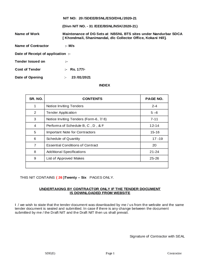 Name of WorkMaintenance of DG Sets atNBSNL BTS sites under Nandurbar SDCA Khondmali, Shanimandal, dlc Collector Office, Kokani Hill: frequently asked questions