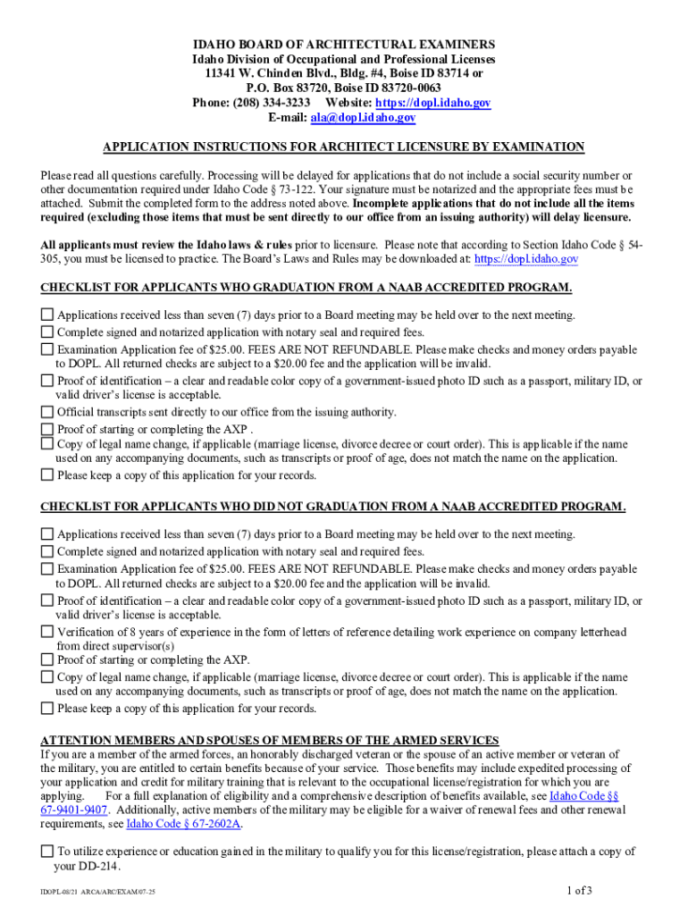 IDAHO BOARD OF ARCHITECTURAL EXAMINERS Idaho Division of Occupational and Professional Licenses 11341 W. Chin den Blvd., Bldg. #4, Boise ID 83714 or P.O. Box 83720, Boise ID 837200063 Phone: (208)