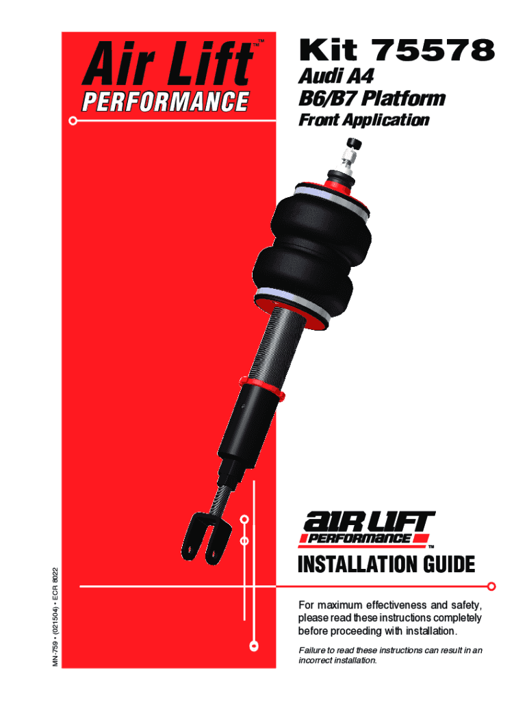 MN759 (021504) ECR 8022Air Lift PERFORMANCE Kit 75578 Audi A4 B6/B7 Platform Front ApplicationINSTALLATION GUIDE For maximum effectiveness and safety, please read these instructions completely before