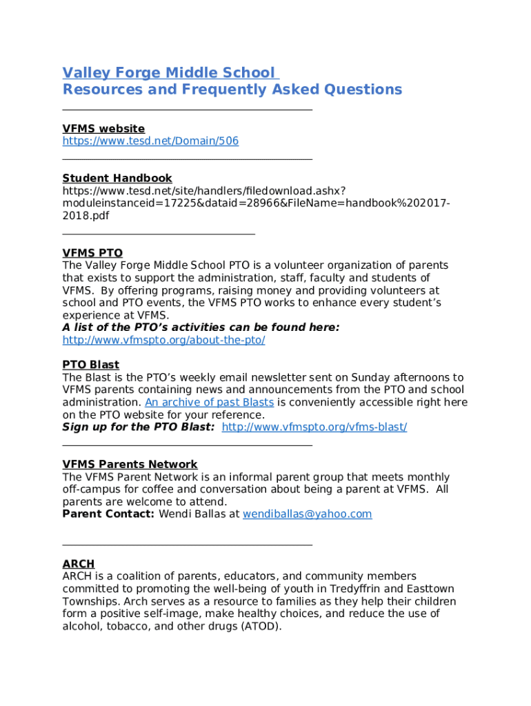 Valley Forge Middle School Student & Parent Handbook ... word template: frequently asked questions