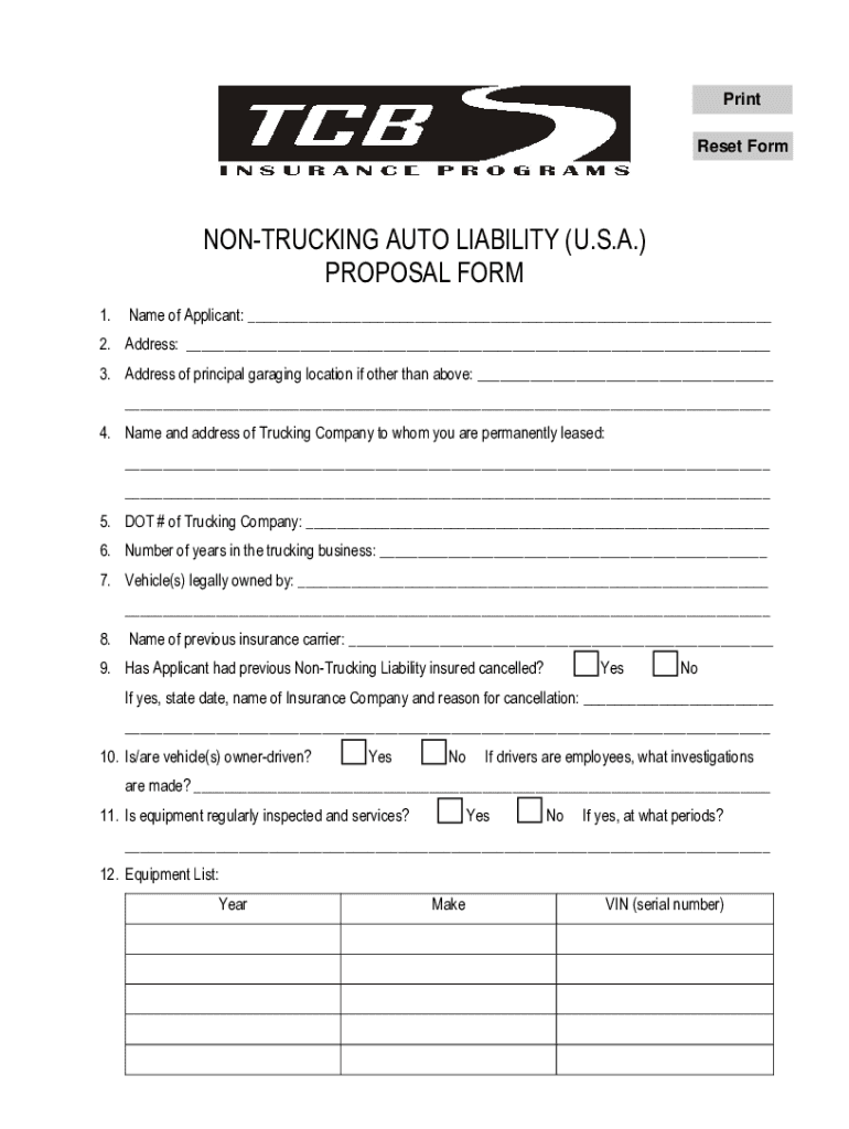 Print Reset FormNONTRUCKING AUTO LIABILITY (U.S.A.) PROPOSAL FORM 1. Name of Applicant: ___2. Address: ___ 3. Address of principal garaging location if other than above: ___ ___ 4. Name and address