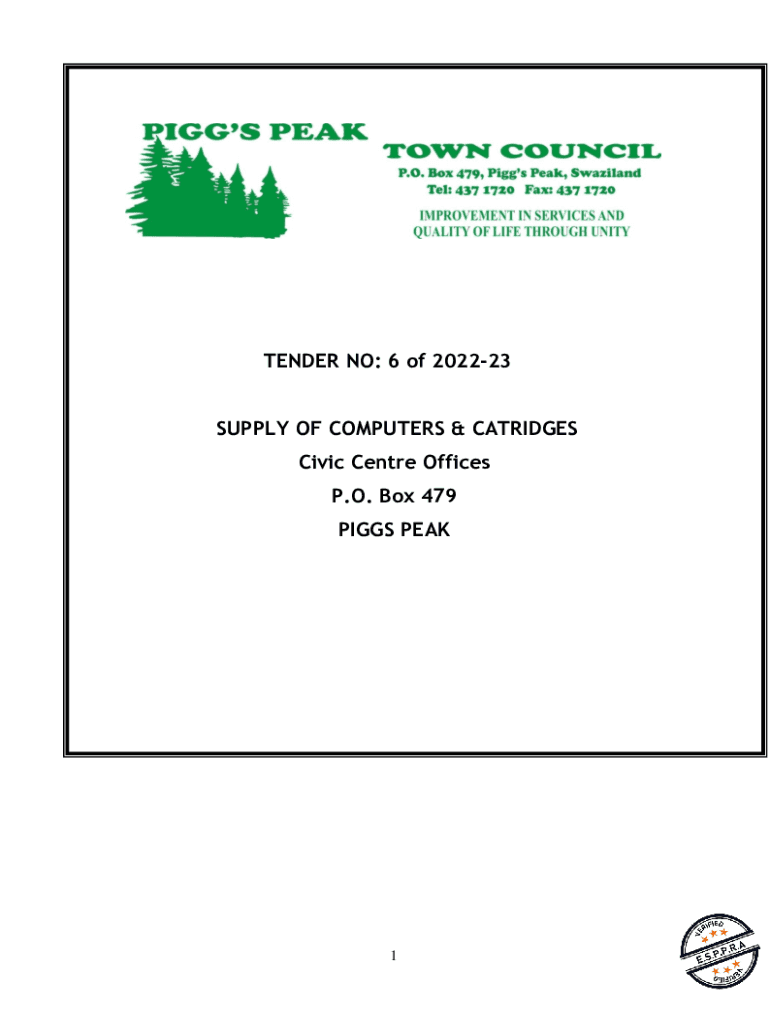 TENDER NO: 6 of 202223 SUPPLY OF COMPUTERS & CARTRIDGES Civic Center Offices P.O. Box 479 PIGS PEAK1TABLE OF CONTENTS DETAILSPAGE1. Preamble 32. General Conditions 3 43. Preliminary Examination54.