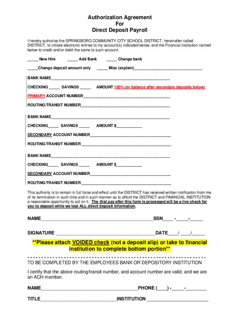Authorization Agreement For Direct Deposit Payroll I hereby authorize the SPRINGBOARD COMMUNITY CITY SCHOOL DISTRICT, hereinafter called DISTRICT, to initiate electronic entries to my account(s) indicated
