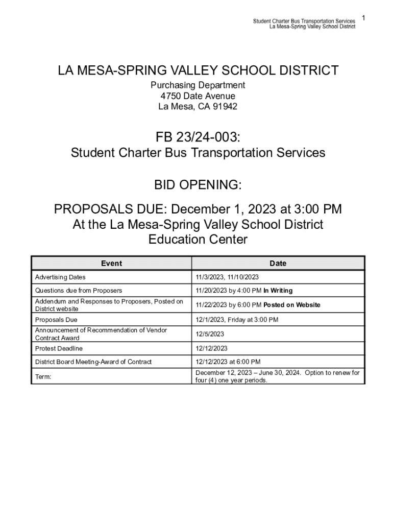 1LA MEASURING VALLEY SCHOOL DISTRICT Purchasing Department 4750 Date Avenue La Mesa, CA 91942FB 23/24003: Student Charter Bus Transportation Services BID OPENING: PROPOSALS DUE: December 1, 2023 at