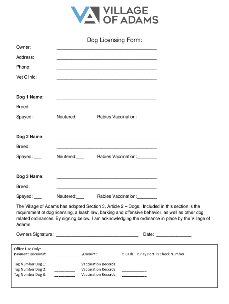 Dog Licensing Form: Owner:___Address:___Phone:___Vet Clinic:___Dog 1 Name:___Breed:___Spayed: ___Neutered:___Dog 2 Name:___Breed:___Spayed: ___Neutered:___Dog 3 Name:___Breed:___Spayed: ___Neutered:___Rabies