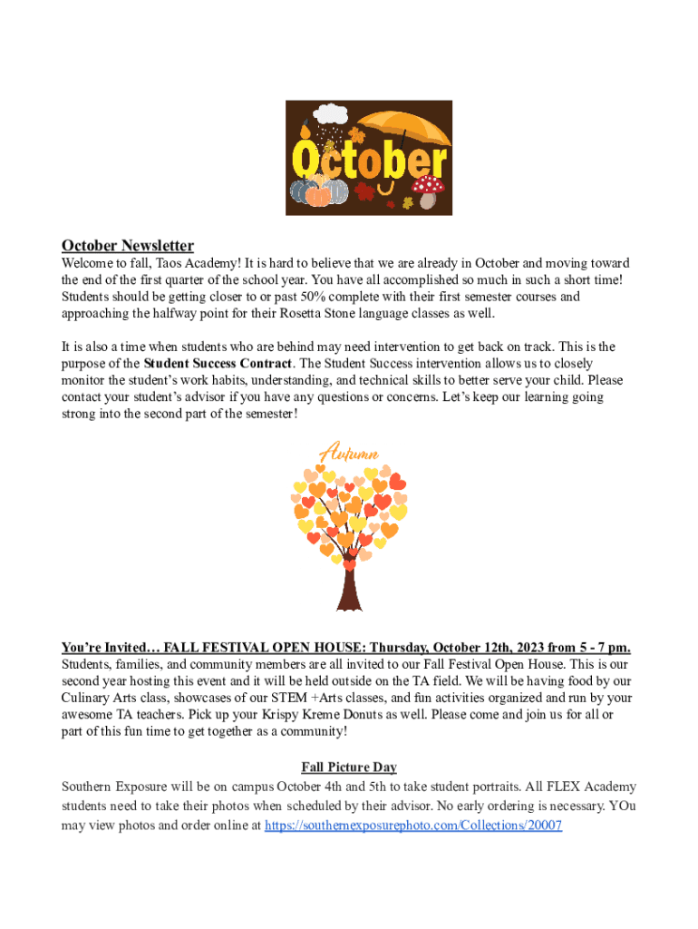 October Newsletter Welcome to fall, Taos Academy! It is hard to believe that we are already in October and moving toward the end of the first quarter of the school year. You have all accomplished