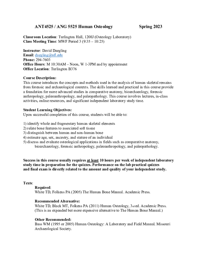 ANT4525 / ANG 5525 Human OsteologySpring 2023Classroom Location: Burlington Hall, 1208J (Astrology Laboratory) Class Meeting Time: WWF Period 3 (9:35 10:25) Instructor: David Dangling Email: daegling@ufl.edu