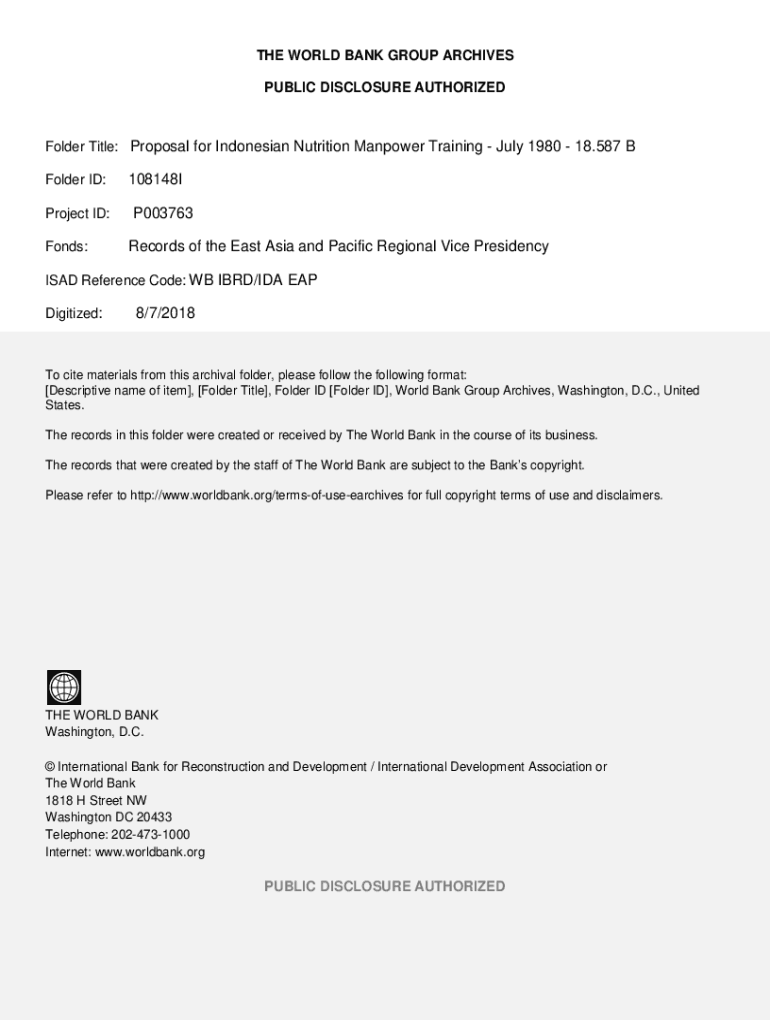 THE WORLD BANK GROUP ARCHIVES PUBLIC DISCLOSURE AUTHORIZEDFolder Title: Proposal for Indonesian Nutrition Manpower Training July 1980 18.587 B Folder ID: Project ID: Finds:108148I P003763 Records