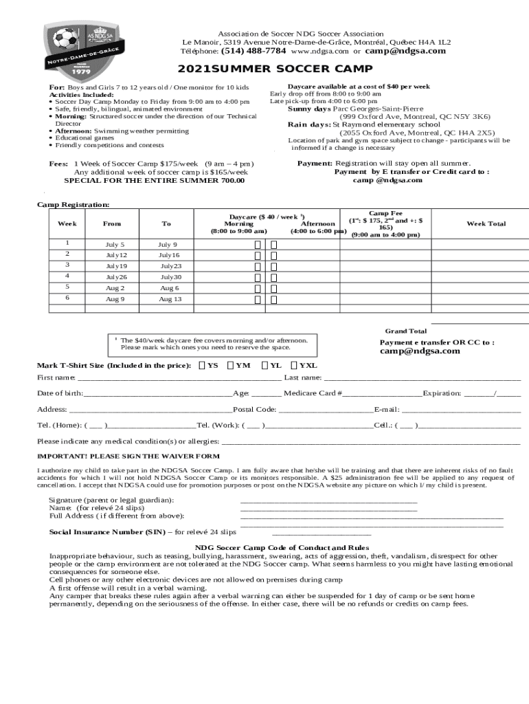 The NDG Soccer Association, Soccer, football in Montreal is a writable document needed to be submitted to the specific address in order to provide specific info. It must be completed and signed, which is possible in hard copy, or by using a certain solution e. g. PDFfiller. This tool lets you complete any PDF or Word document directly from your browser (no software requred), customize it according to your needs and put a legally-binding e-signature. Right after completion, user can send the NDG Soccer Association, Soccer, football in Montreal to the appropriate individual, or multiple individuals via email or fax. The editable template is printable too thanks to PDFfiller feature and options proposed for printing out adjustment. In both electronic and physical appearance, your form will have got clean and professional outlook. Also you can turn it into a template for further use, there's no need to create a new file from scratch. You need just to edit the ready template.