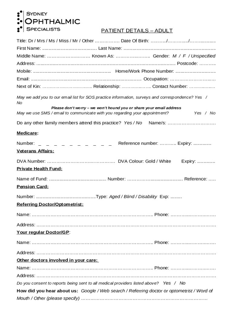 The s PATIENT DETAILSadult is a fillable form in MS Word extension that has to be filled-out and signed for specified needs. Then, it is provided to the exact addressee in order to provide some information and data. The completion and signing may be done in hard copy or using a suitable tool like PDFfiller. Such tools help to fill out any PDF or Word file without printing them out. It also lets you edit it for your needs and put an official legal digital signature. Upon finishing, the user ought to send the s PATIENT DETAILSadult to the respective recipient or several of them by mail and also fax. PDFfiller has a feature and options that make your template printable. It has different settings when printing out appearance. No matter, how you'll file a form after filling it out - physically or by email - it will always look professional and firm. In order not to create a new editable template from the beginning again and again, make the original Word file as a template. After that, you will have a customizable sample.