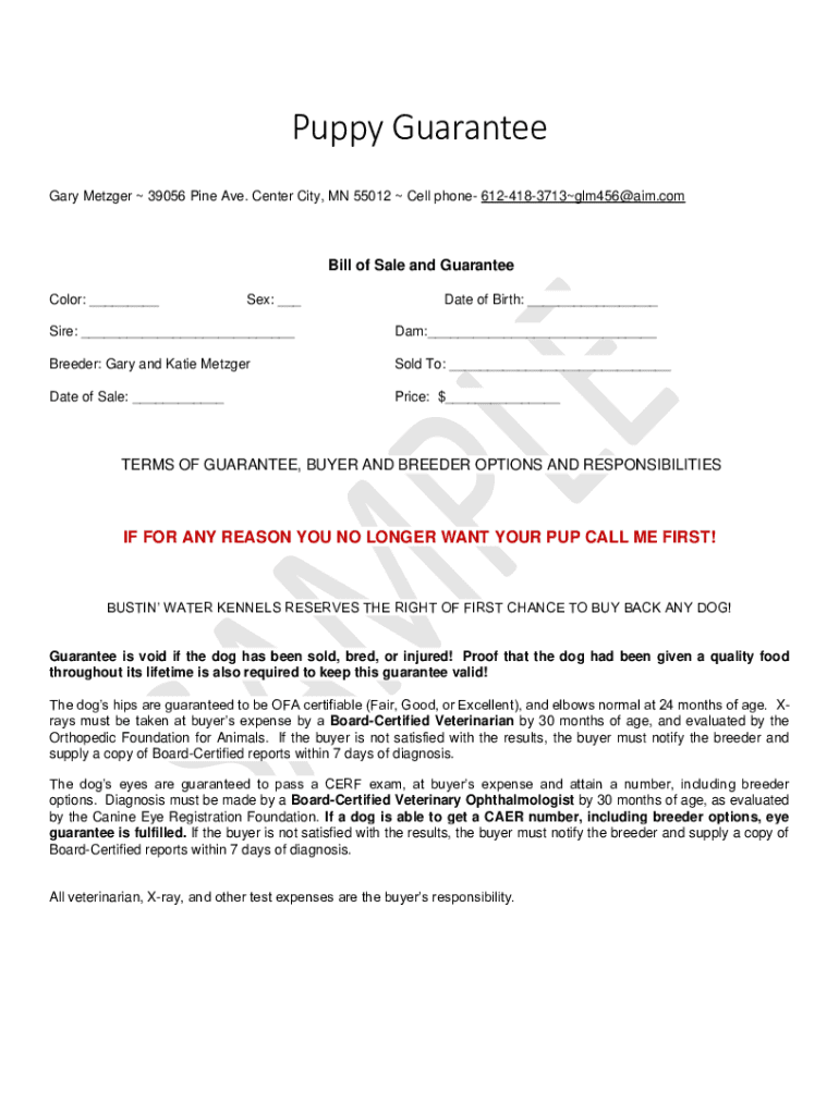 Puppy Guarantee Gary Metzger 39056 Pine Ave. Center City, MN 55012 Cell phone 6124183713glm456@aim.comBill of Sale and Guarantee Color: ___Sex: ___Date of Birth: ___Sire: ___Dam:___Breeder: Gary and