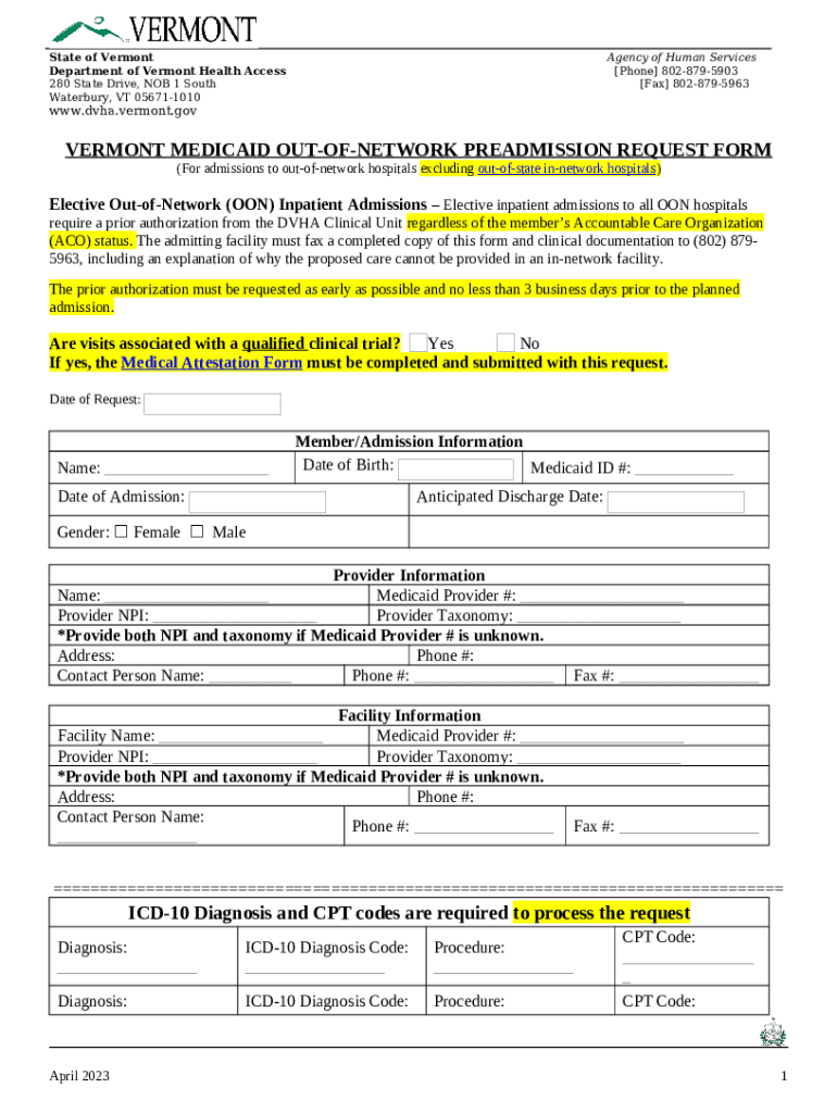 Vermont Medicaid Out-of-Network Preadmission Request - dvha vermont template instructions