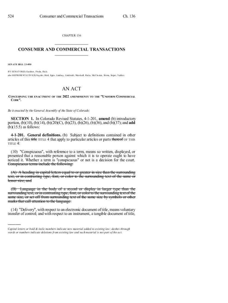 524Consumer and Commercial Transactions Ch. 136CHAPTER 136___ CONSUMER AND COMMERCIAL TRANSACTIONS ___ SENATE BILL 23090 BY SENATOR(S) Gardner, Prior, Rich; also REPRESENTATIVE(S) Snyder, Bird, EPP,