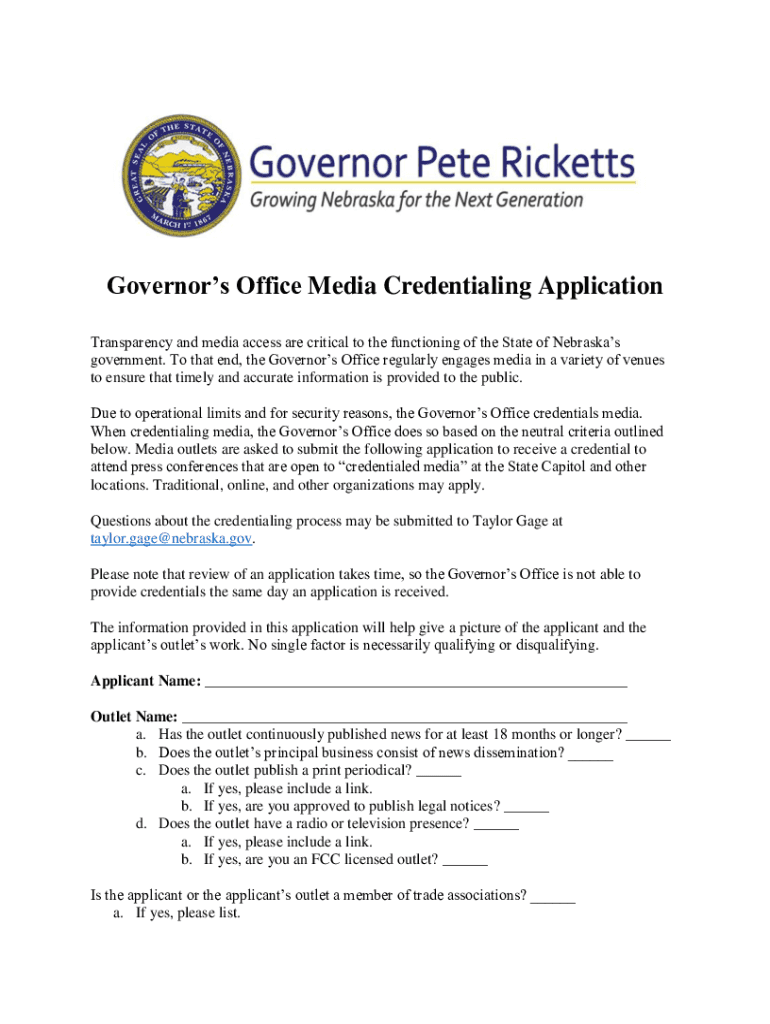 Governors Office Media Credentialing Application Transparency and media access are critical to the functioning of the State of Nebraskas government. To that end, the Governors Office regularly engages