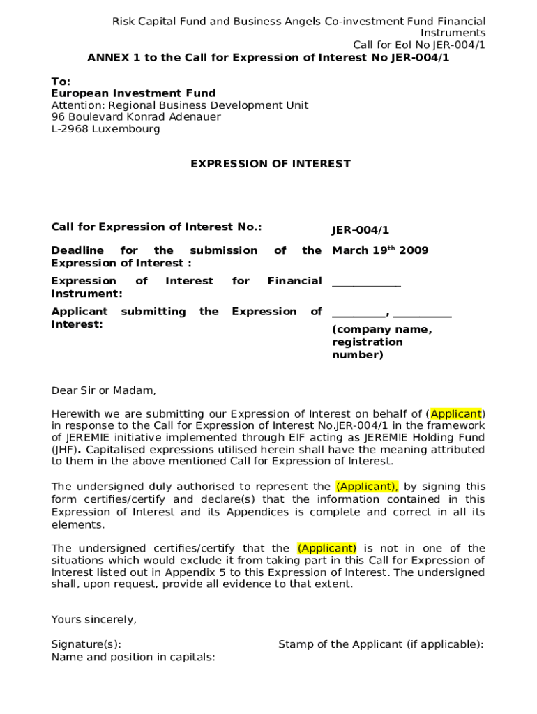 Instructions for the ANNEX 1 to the Call for Expression of Interest No JER-004/3 form