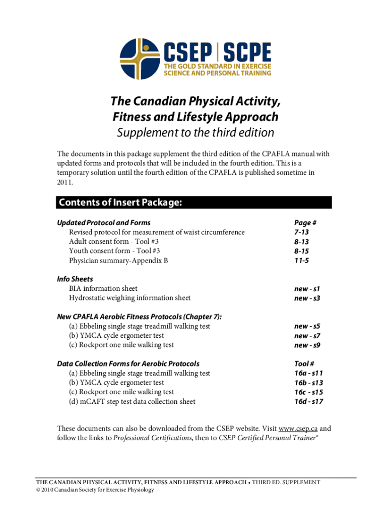 The Canadian Physical Activity, Fitness and Lifestyle Approach Supplement to the third edition The documents in this package supplement the third edition of the CPAFLA manual with updated forms and