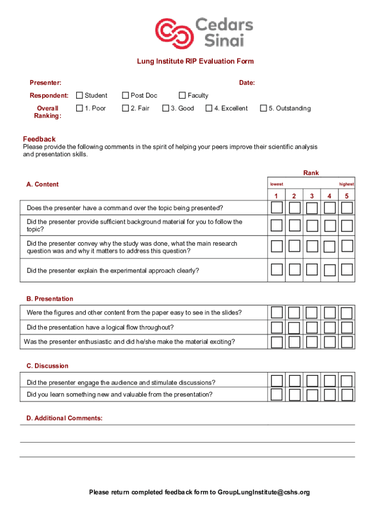 Lung Institute RIP Evaluation Form Presenter:Date:Respondent:Student Post Coverall Ranking:1. Poor2. Fearfully 3. Good4. Excellent5. OutstandingFeedback Please provide the following comments in the