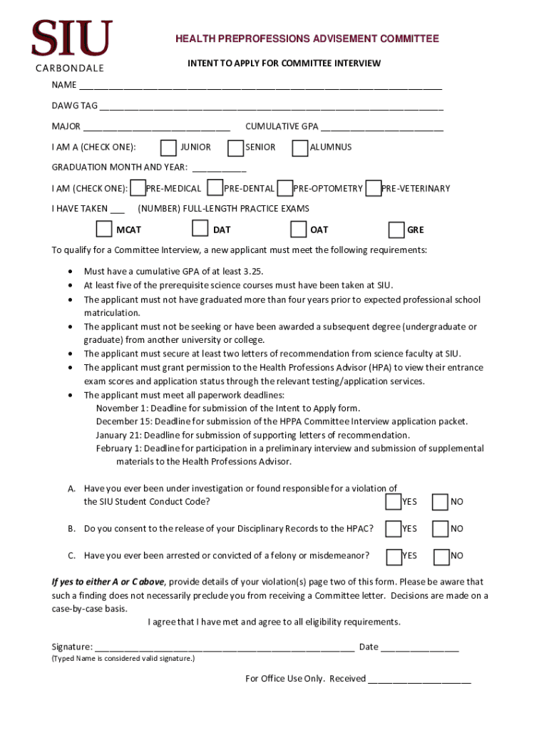 INTENT TO APPLY FOR COMMITTEE INTERVIEW