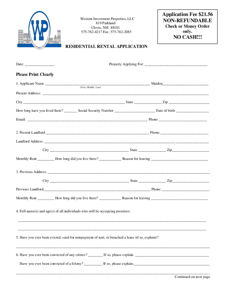 Western Investment Properties, LLC 819 Parkland Clovis, NM 88101 5757624217 Fax: 5757622085Application Fee $21.56 NONREFUNDABLE Check or Money Order only.NO CASH!!! RESIDENTIAL RENTAL APPLICATIONDate: