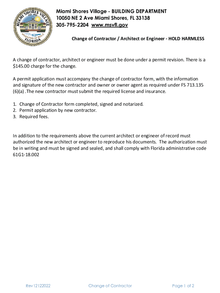 Miami Shores Village BUILDING DEPARTMENT 10050 NE 2 Ave Miami Shores, FL 33138 3057952204 www.msvfl.gov Change of Contractor / Architect or Engineer HOLD HARMLESS change of contractor, architect or