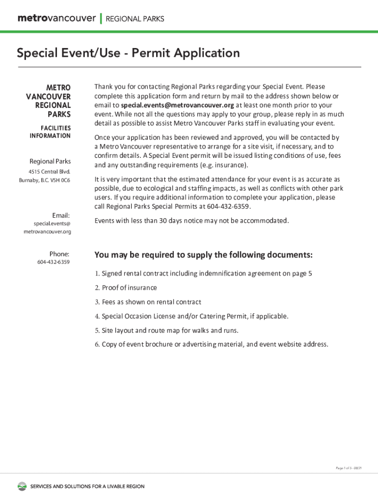 Permit ApplicationSpecial SpecialEvent/Use Event/UsePermit PermitApplication ApplicationSpecial Event/Use Permit Application METRO VANCOUVER REGIONAL PARKS METRO METRO VANCOUVER VANCOUVER FACILITIES