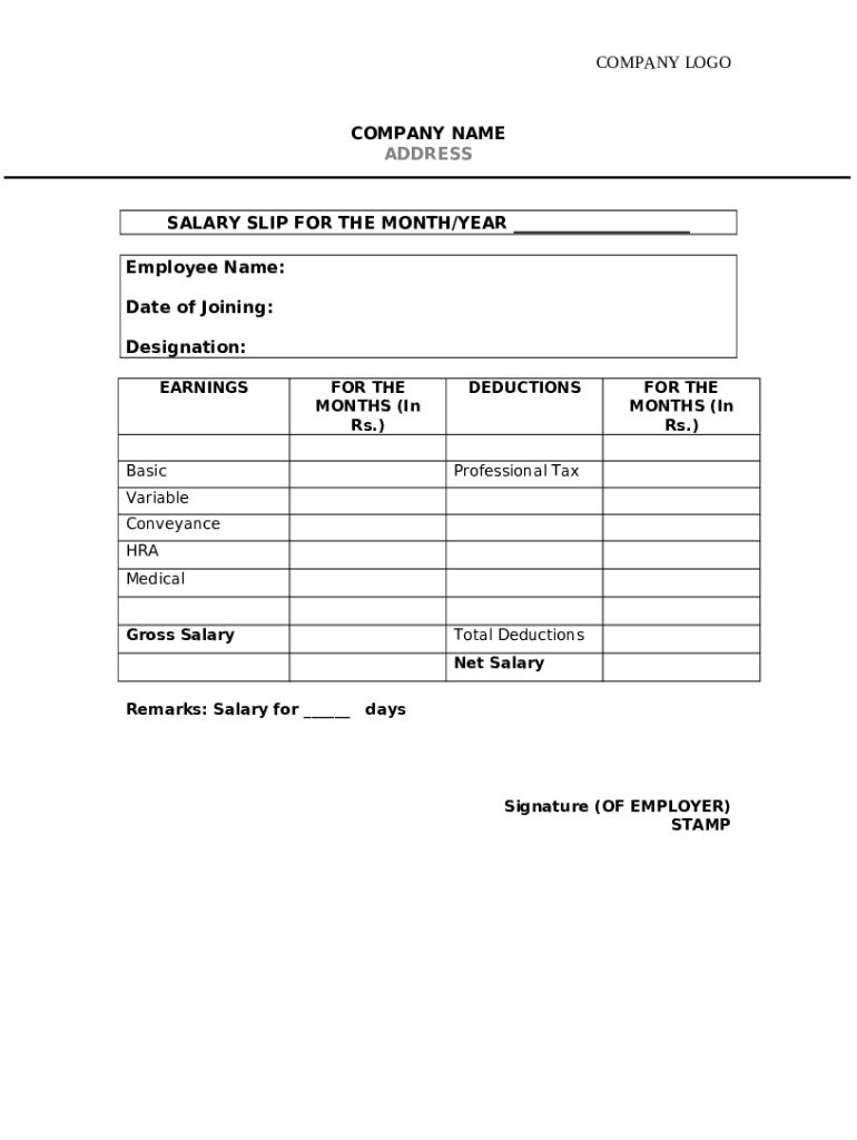 Moreover, a standardized salary slip aids in maintaining payroll records, ensuring compliance with various employment laws. It also acts as a measure to minimize errors in salary calculations, ultimately streamlining the payroll process.