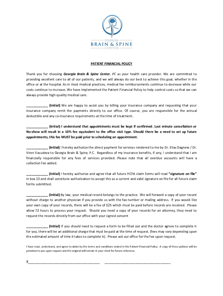 PATIENT FINANCIAL POLICY Thank you for choosing Georgia Brain & Spine Center, PC as your health care provider. We are committed to providing excellent care to all of our patients, and we will always