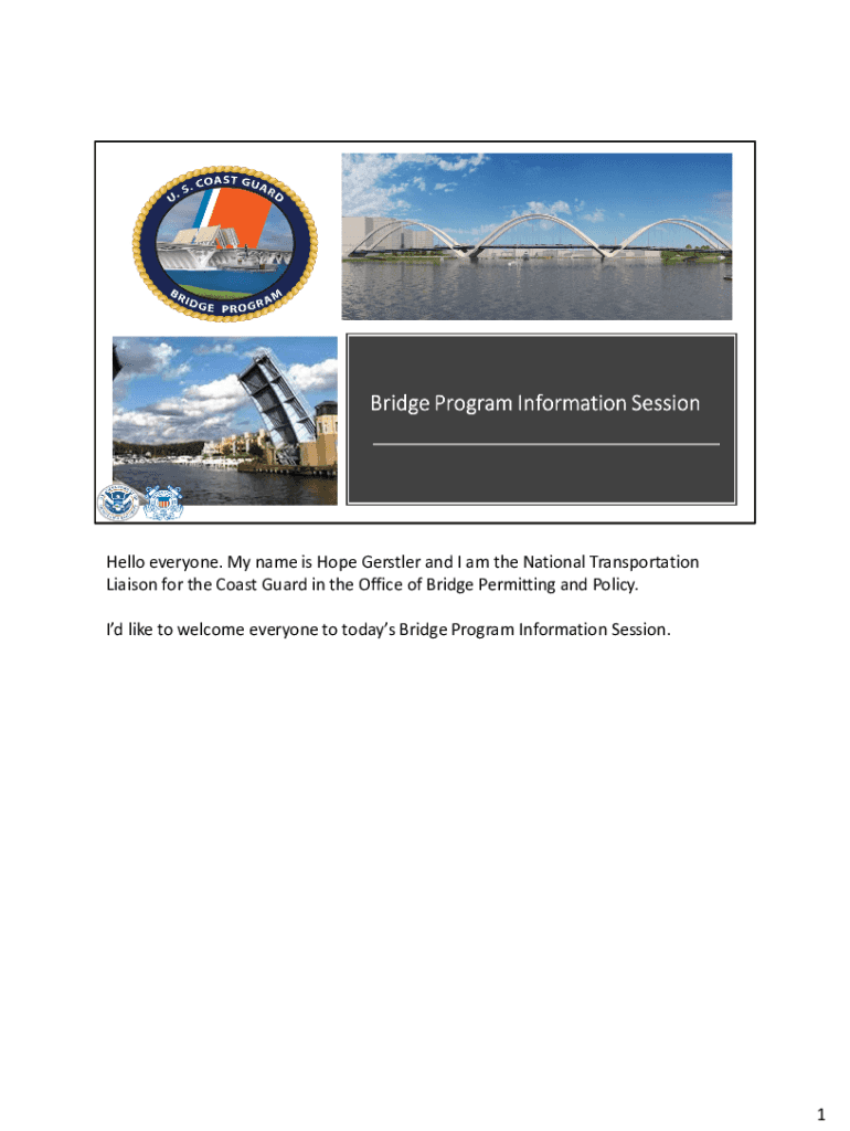 Hello everyone. My name is Hope Gerstler and I am the National Transportation Liaison for the Coast Guard in the Office of Bridge Permitting and Policy. Id like to welcome everyone to todays Bridge