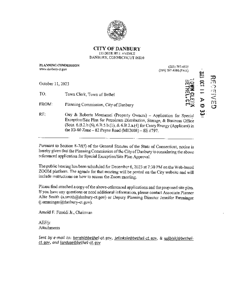 CITY o O1c0q\'e OflR1E0CITY OF DANBURY 155 DEER HILL AVENUEDANBURY, CONNECTICUT 06810 PLANNING www.COMMISSIONdanburyct.203) 797 4525gov203) 797 4586(FAX)IN 4tlOctober 11, 2023rriTO:Town Clerk, TownFROM:Planning