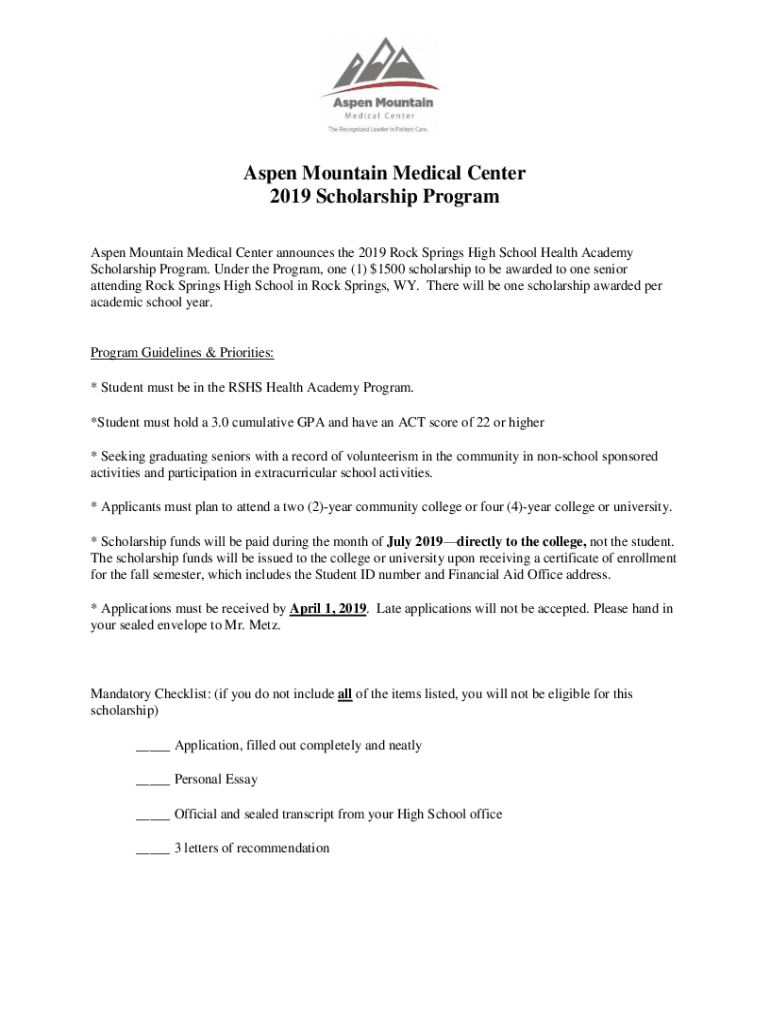 Aspen Mountain Medical Center 2019 Scholarship Program Aspen Mountain Medical Center announces the 2019 Rock Springs High School Health Academy Scholarship Program. Under the Program, one (1) $1500