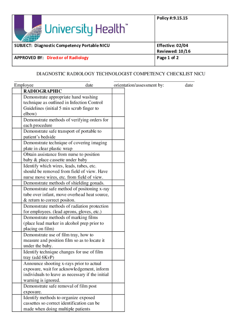 Policy#:9.15.15SUBJECT:DiagnosticCompetencyPortableNICU APPROVED:DirectorofRadiologyEffective:02/04 Reviewed:10/16 Page1of2DIAGNOSTIC RADIOLOGY TECHNOLOGIST COMPETENCY CHECKLIST NICU ___ ___ Employee