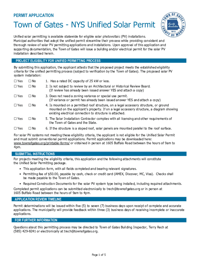 PERMIT APPLICATIONTown of Gates NYS Unified Solar Permit Unified solar permitting is available statewide for eligible solar photovoltaic (PV) installations. Municipal authorities that adopt the unified