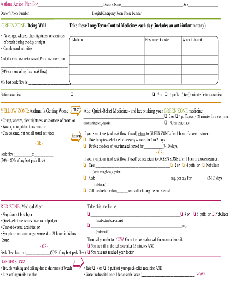 Asthma Action Plan For___Doctors Name___Date___ Doctors Phone Number___GREEN ZONE: Doing WellHospital/Emergency Room Phone Number___Take these LongTermControl Medicines each day (includes an antiinflammatory)