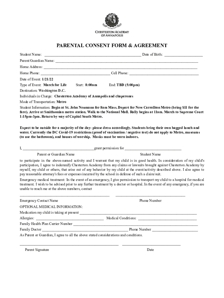 PARENTAL CONSENT FORM & AGREEMENT Student Name: ___ Date of Birth: ___ Parent/Guardian Name: ___ Home Address: ___ Home Phone: ___ Cell Phone: ___ Date of Event: 1/21/22 Type of Event: March for LifeStart: