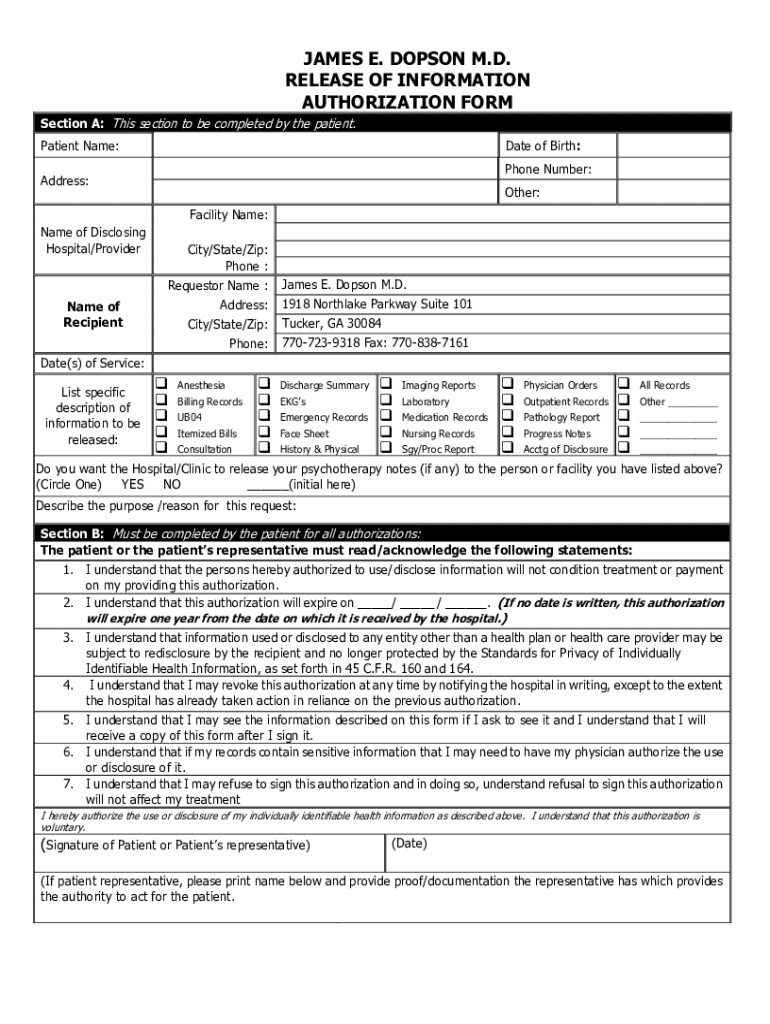 JAMES E. DODSON M.D. RELEASE OF INFORMATION AUTHORIZATION FORM Section A: This section to be completed by the patient. Patient Name:Date of Birth: Phone Number:Address:Other: Facility Name:Name of