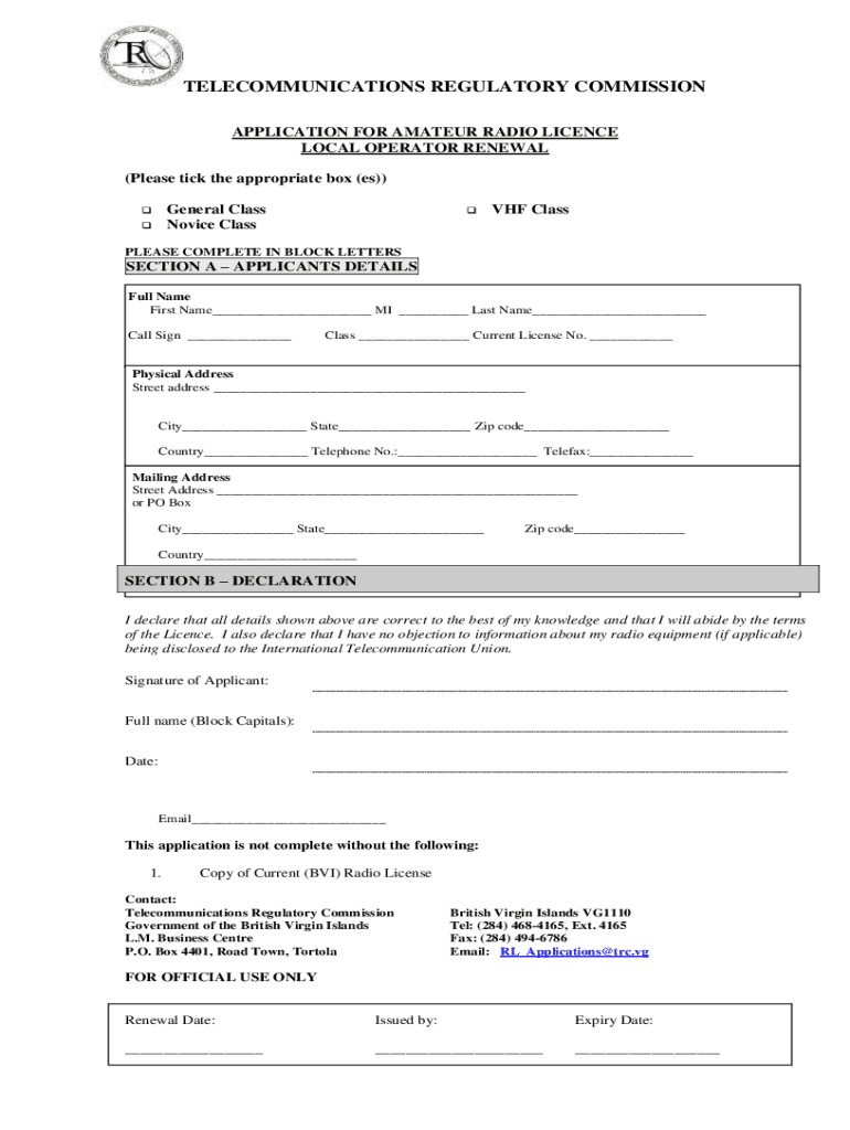 TELECOMMUNICATIONS REGULATORY COMMISSION APPLICATION FOR AMATEUR RADIO LICENCE LOCAL OPERATOR RENEWAL (Please tick the appropriate box (es)) General Class Novice Class VHF ClassPLEASE COMPLETE IN