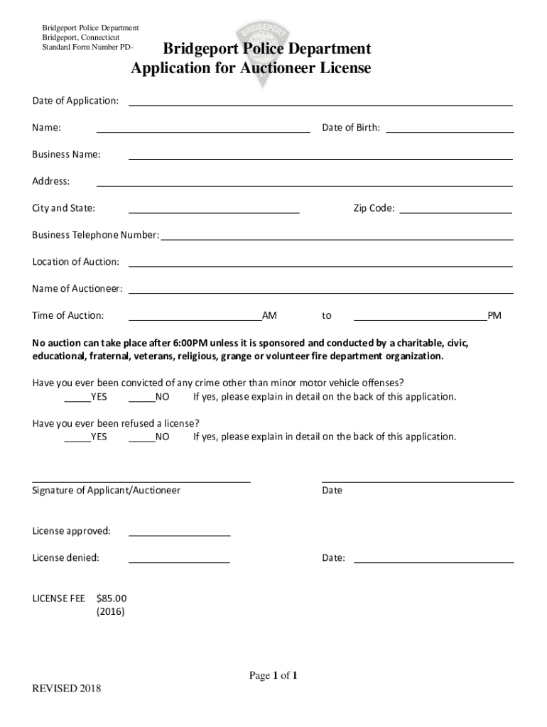 Bridgeport Police Department Bridgeport, Connecticut Standard Form Number PD Bridgeport Police Department Application for Auctioneer LicenseRevised 10/2017Date of Application: ___ Name:___Business