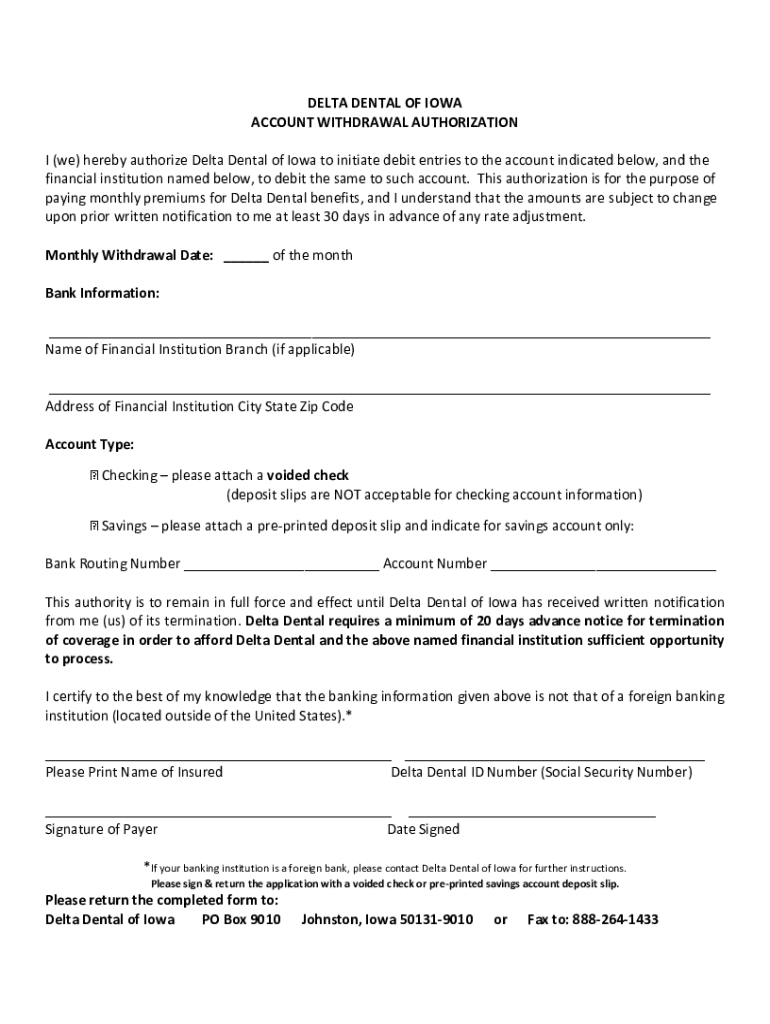 Get the free delta dental of iowa account withdrawal authorization