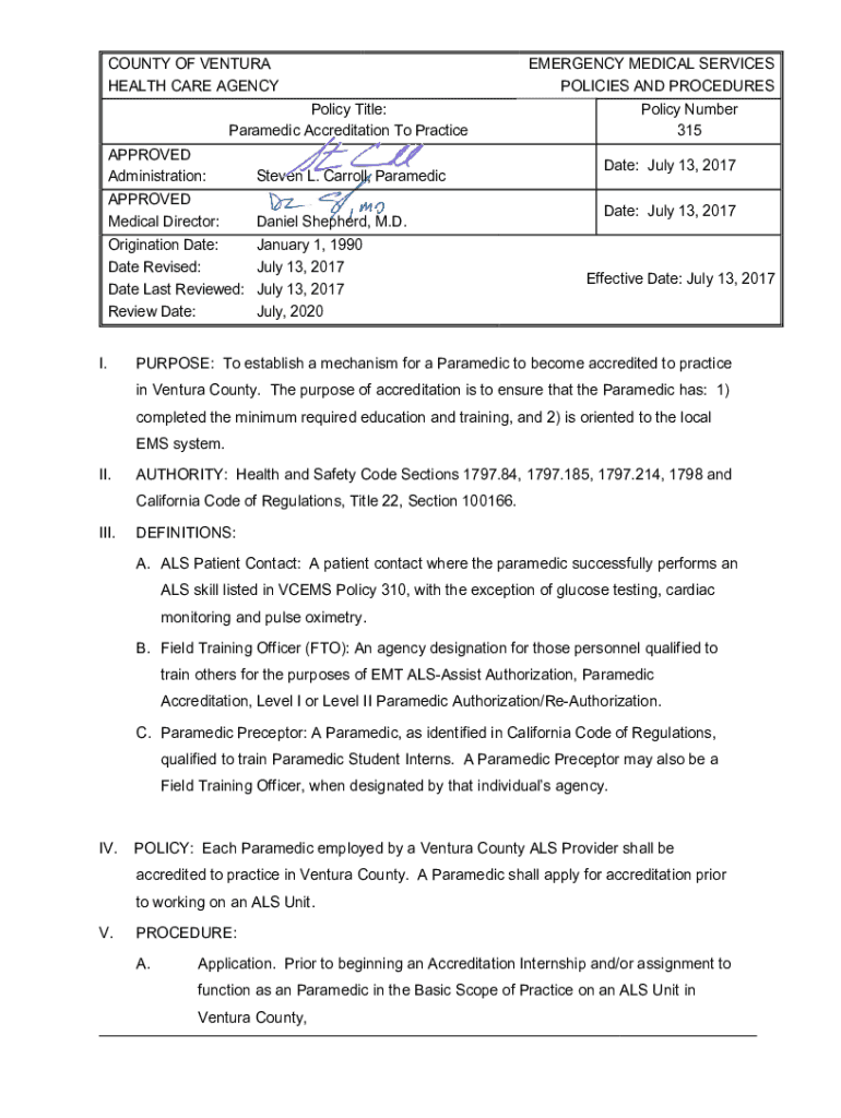COUNTY OF VENTURA HEALTH CARE AGENCY Policy Title: Paramedic Accreditation To Practice APPROVED Administration: APPROVED Medical Director: Origination Date: Date Revised: Date Last Reviewed: Review