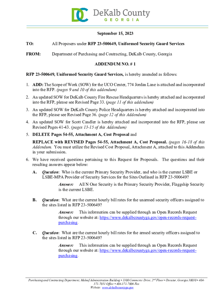 September 15, 2023, TO:All Proposers under RFP 23500649, Uniformed Security Guard ServicesFROM:Department of Purchasing and Contracting, DeKalb County, Georgia ADDENDUM NO. # 1RFP 23500649, Uniformed