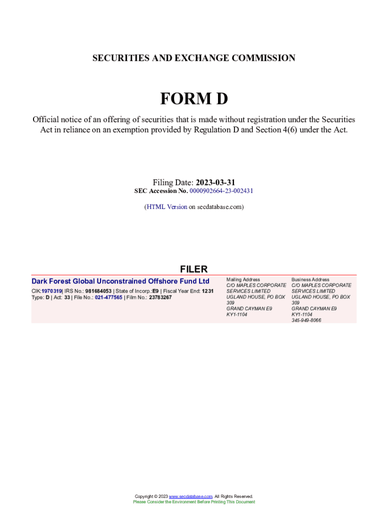 Get the free Dark Forest Global Unconstrained Offshore Fund Ltd Form D Filed 2023-03-31. Accessio...
