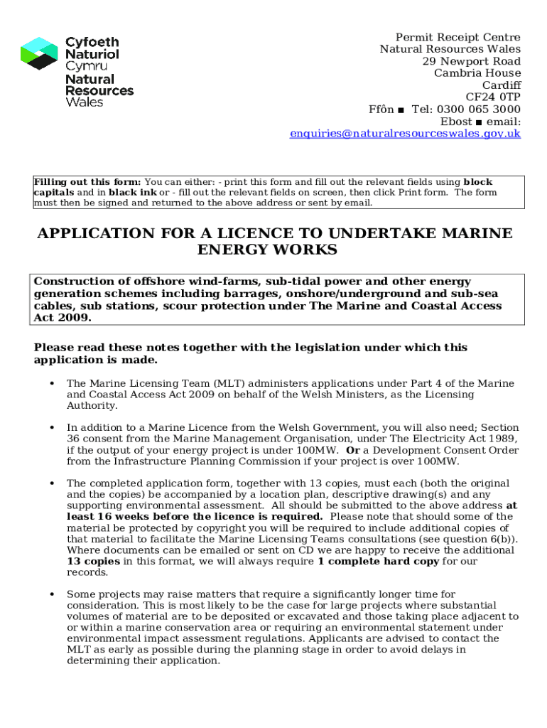 The Natural Resources Wales / Marine licence application s is a writable document needed to be submitted to the specific address in order to provide some info. It has to be completed and signed, which can be done in hard copy, or with the help of a certain solution like PDFfiller. It helps to fill out any PDF or Word document directly from your browser (no software requred), customize it depending on your purposes and put a legally-binding e-signature. Once after completion, you can easily send the Natural Resources Wales / Marine licence application s to the appropriate recipient, or multiple individuals via email or fax. The blank is printable as well due to PDFfiller feature and options offered for printing out adjustment. Both in electronic and physical appearance, your form will have a clean and professional outlook. It's also possible to save it as the template for later, so you don't need to create a new blank form from scratch. All that needed is to customize the ready sample.