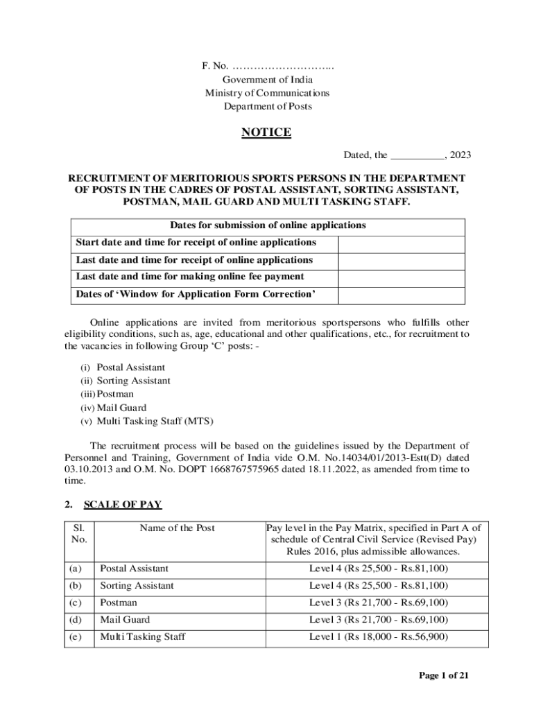 F. No. . Government of India Ministry of Communications Department of PostsNOTICE Dated, the ___, 2023 RECRUITMENT OF MERITORIOUS SPORTS PERSONS IN THE DEPARTMENT OF POSTS IN THE CADRES OF POSTAL